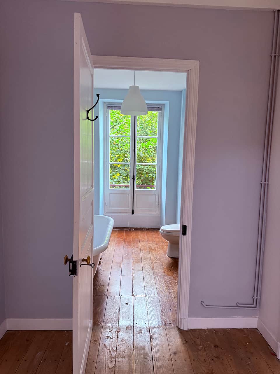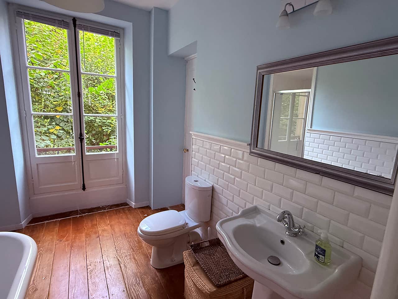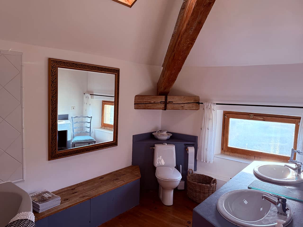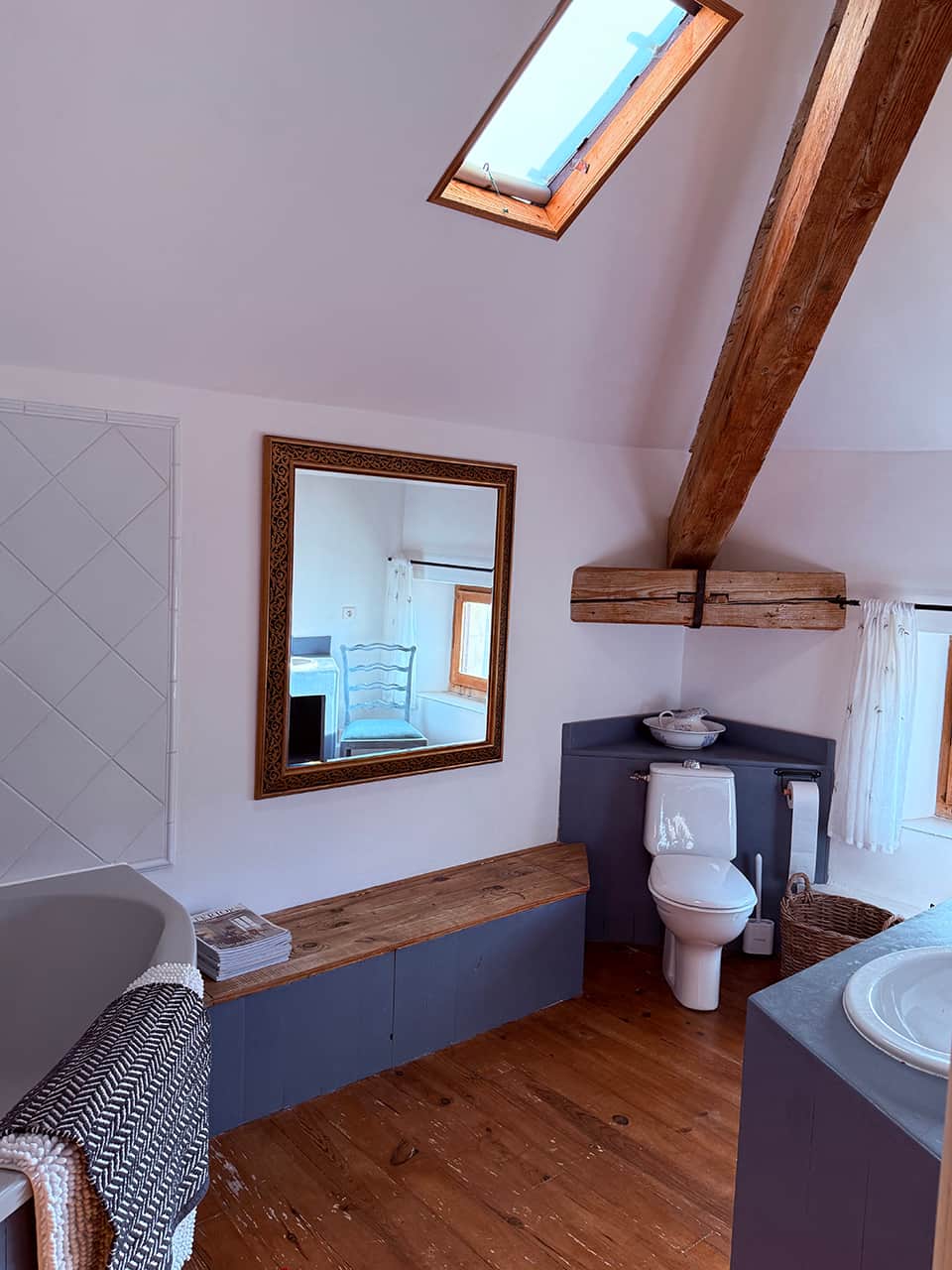 The bathroom is both practical and stylish, featuring a large bath for relaxation, twin white sinks for added convenience, and a WC. It’s a bright, functional space that maintains the home’s character.
