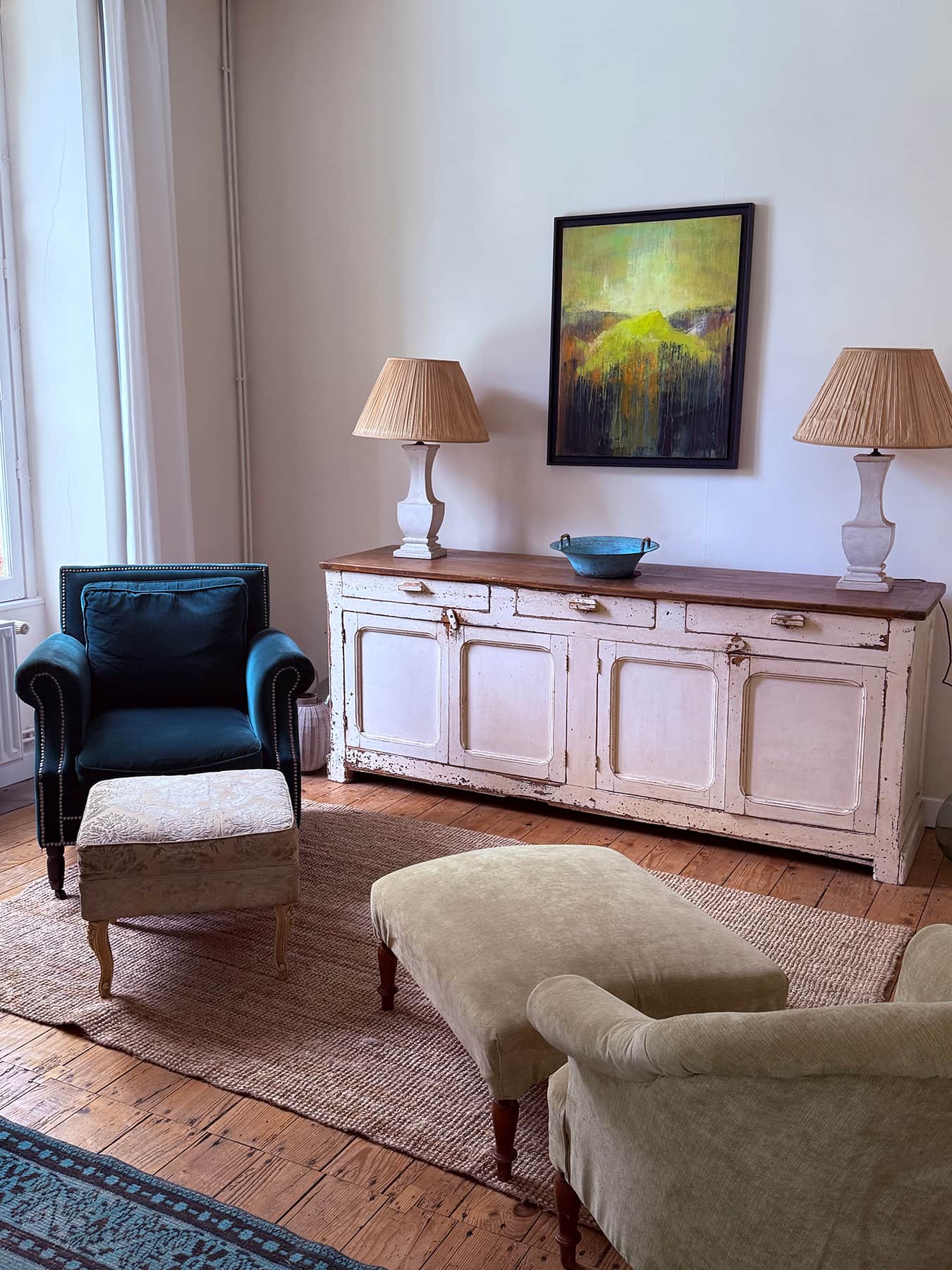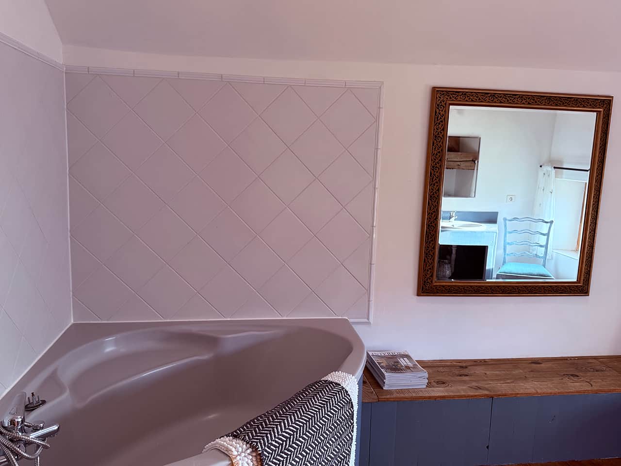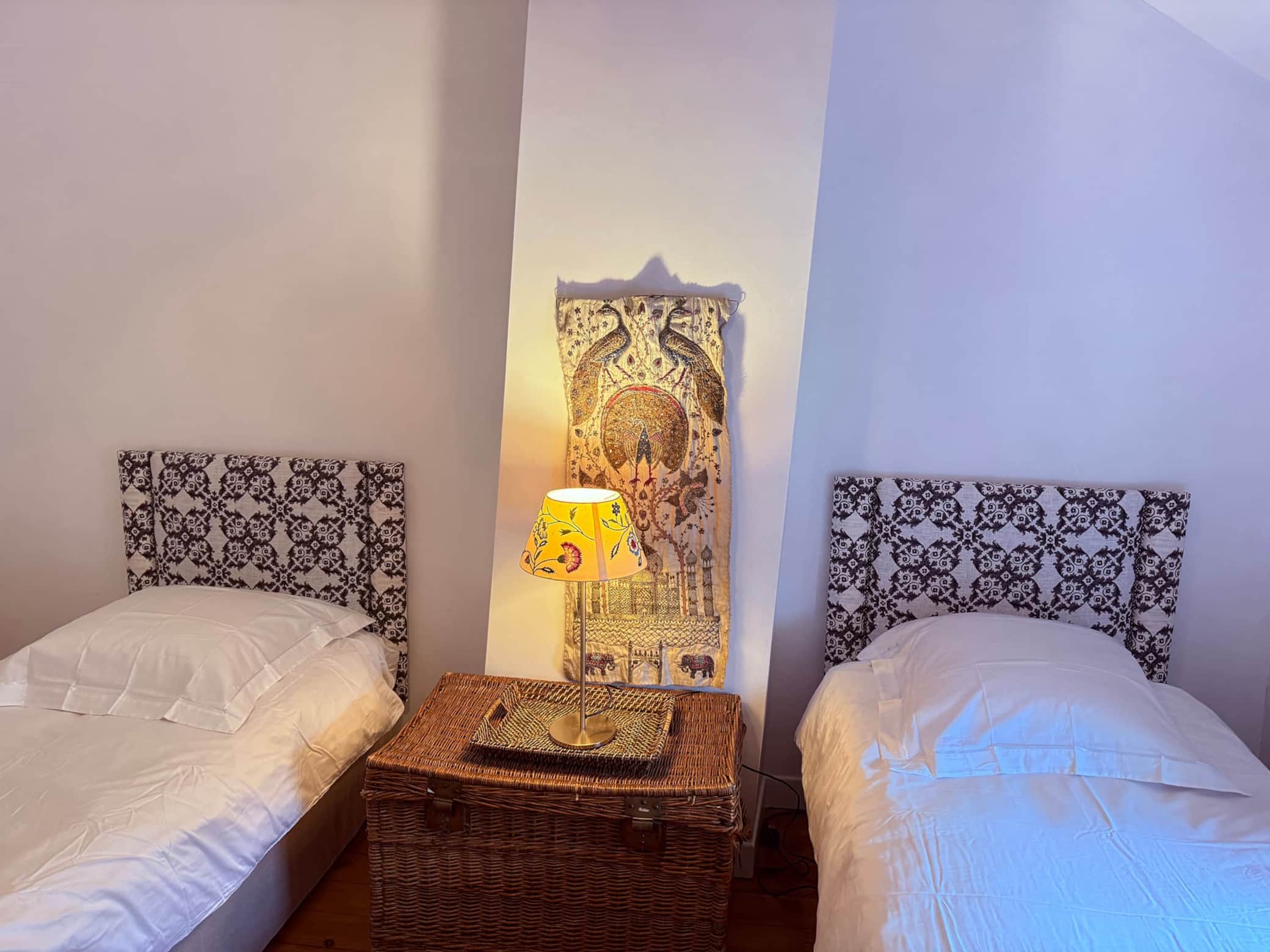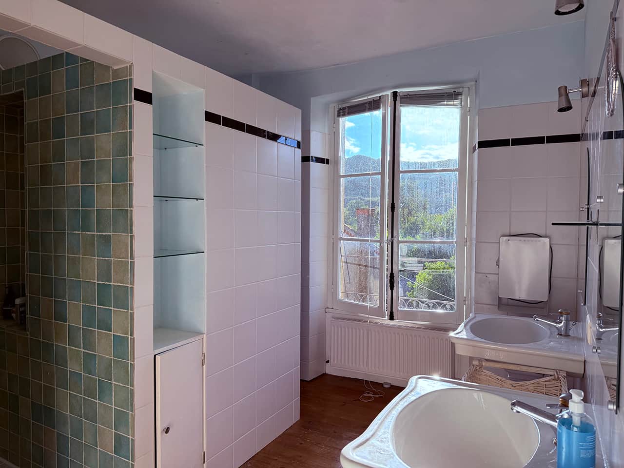 The bathroom is both practical and stylish, featuring a large bath for relaxation, twin white sinks for added convenience, and a WC. It’s a bright, functional space that maintains the home’s character.