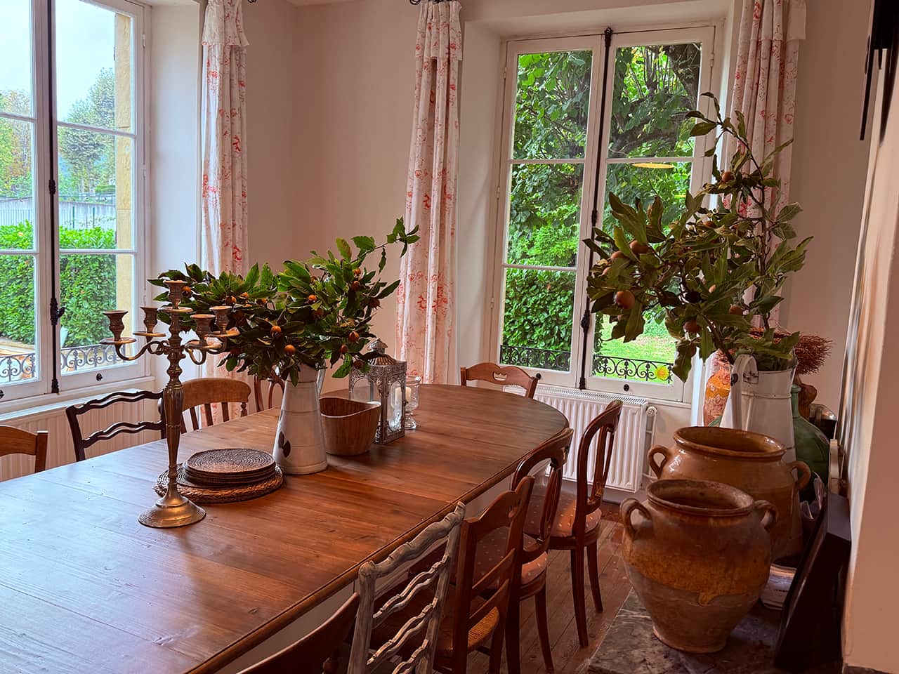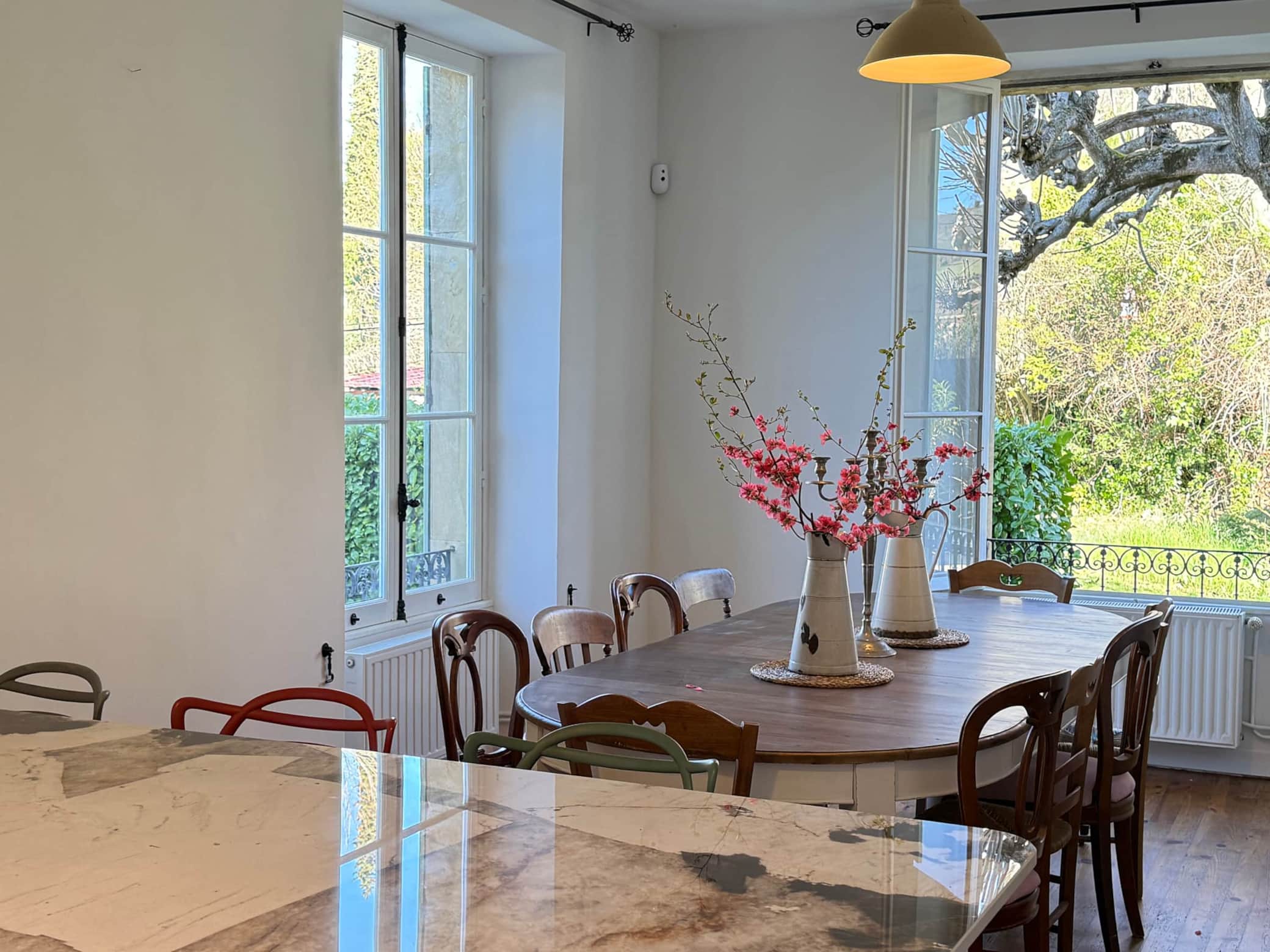 The dining area impresses in equal measure, offering generous room for a large table—perfect for hosting meals and lively gatherings. Two wide windows flood the room with light, creating a bright and airy ambiance.