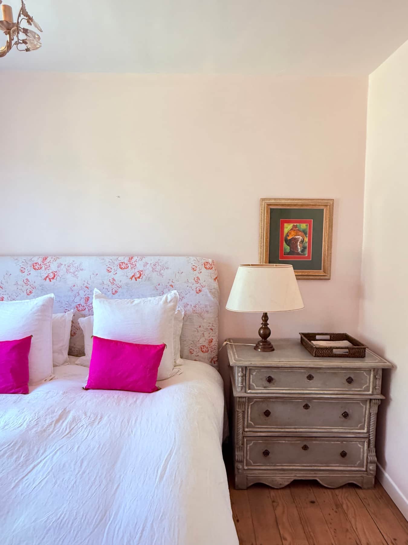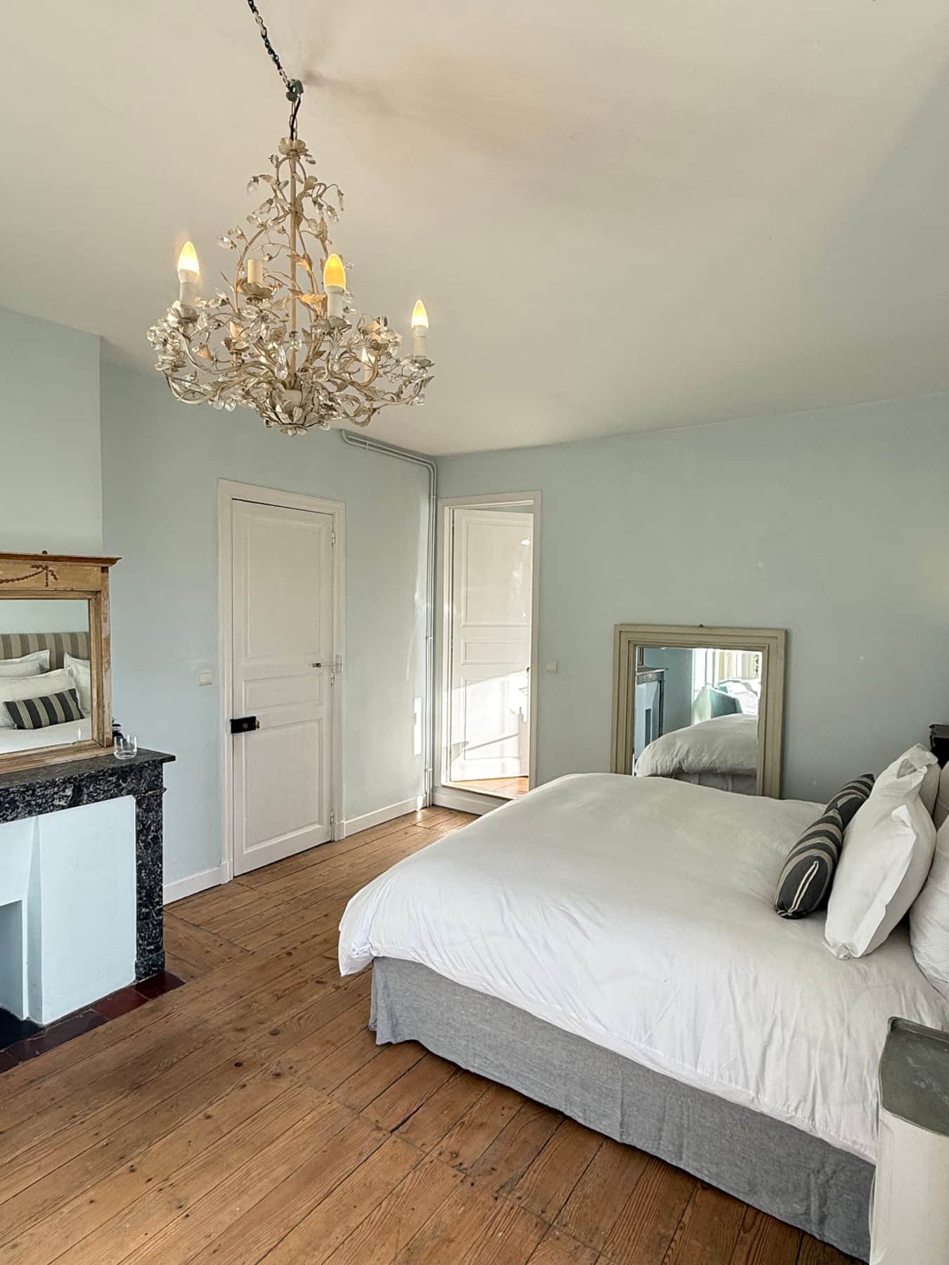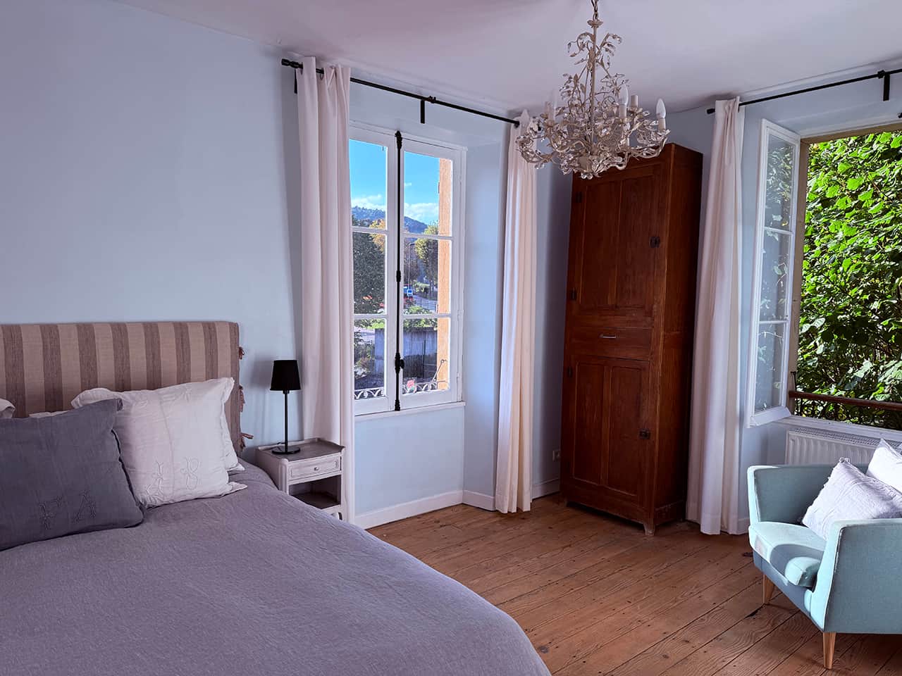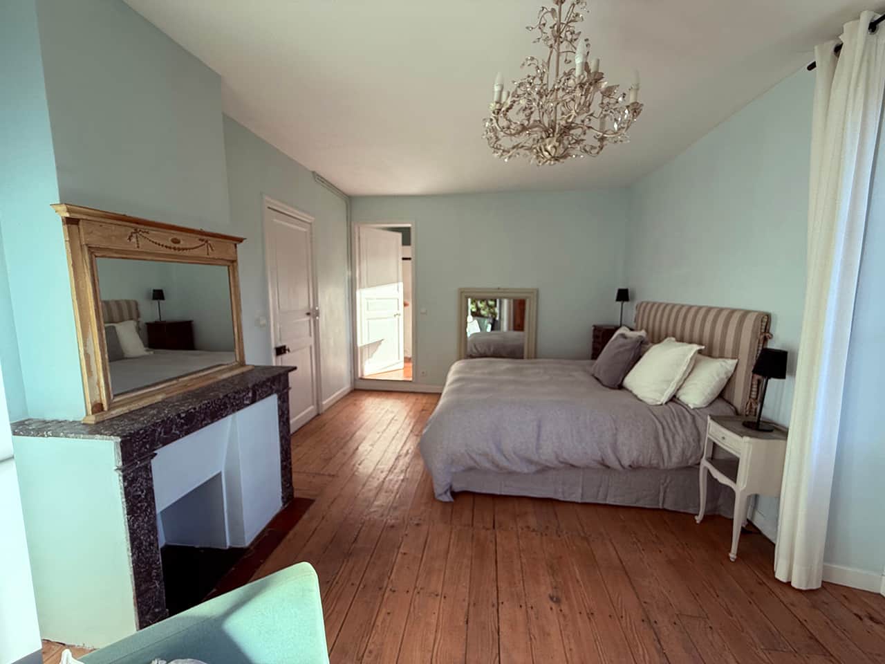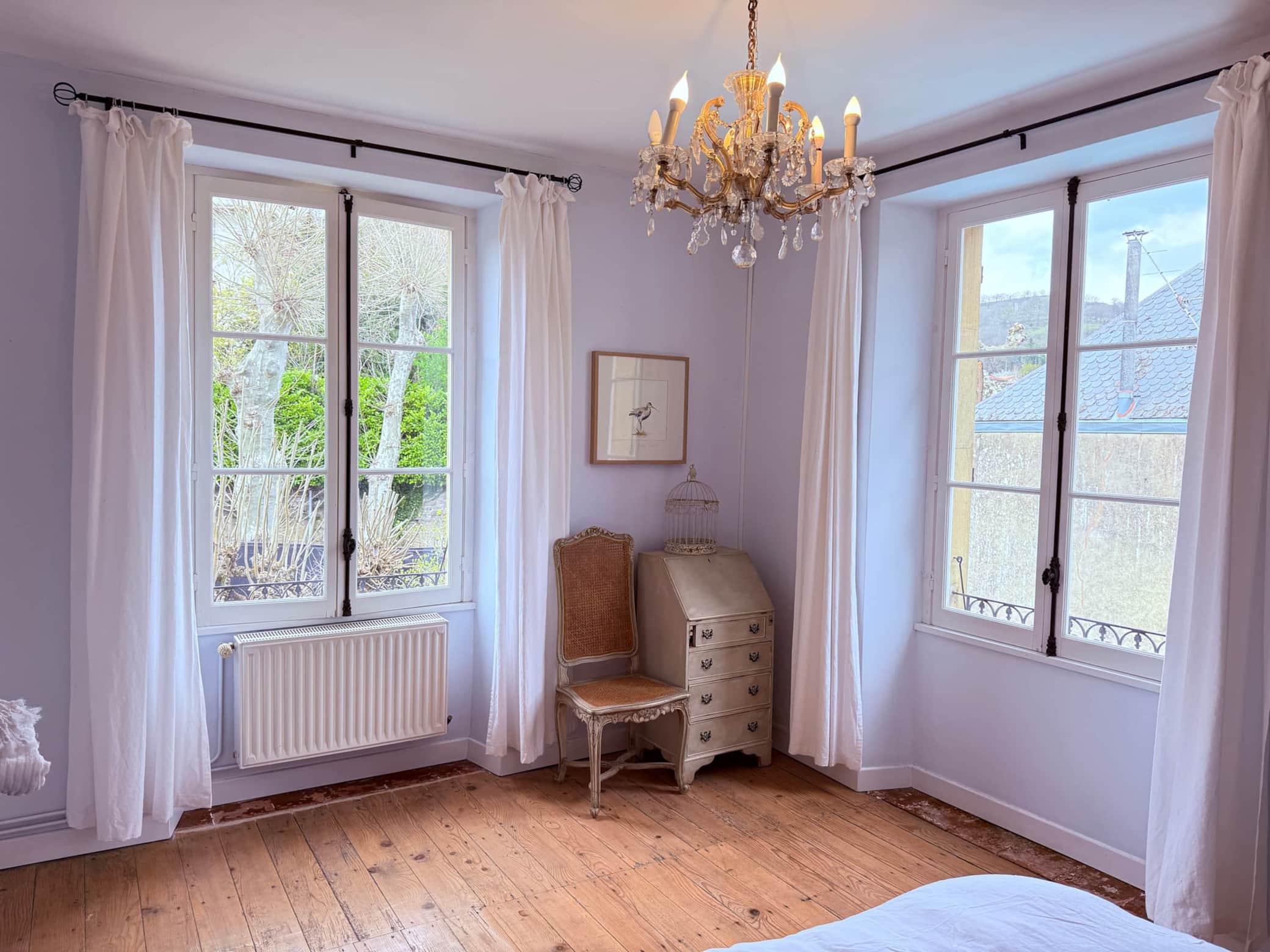 The first bedroom offers a comfortable retreat, complete with an en-suite featuring a walk-in shower, WC, and twin pedestal sinks. Two large windows flood the room with natural light, highlighting the warmth of the original wooden floor. The room's character is further enriched by the presence of an original fireplace, though it remains non-functional, adding a touch of historic charm.