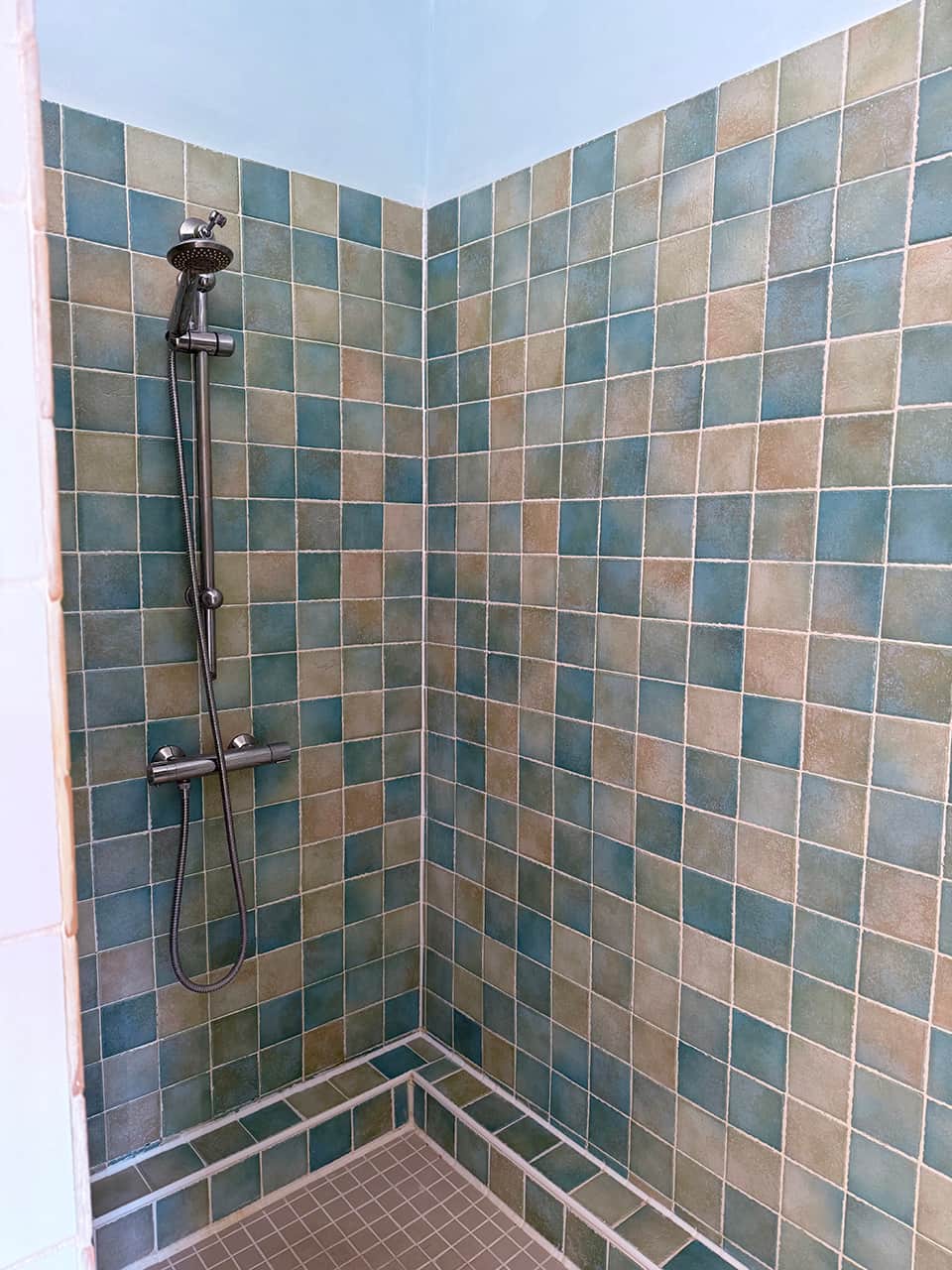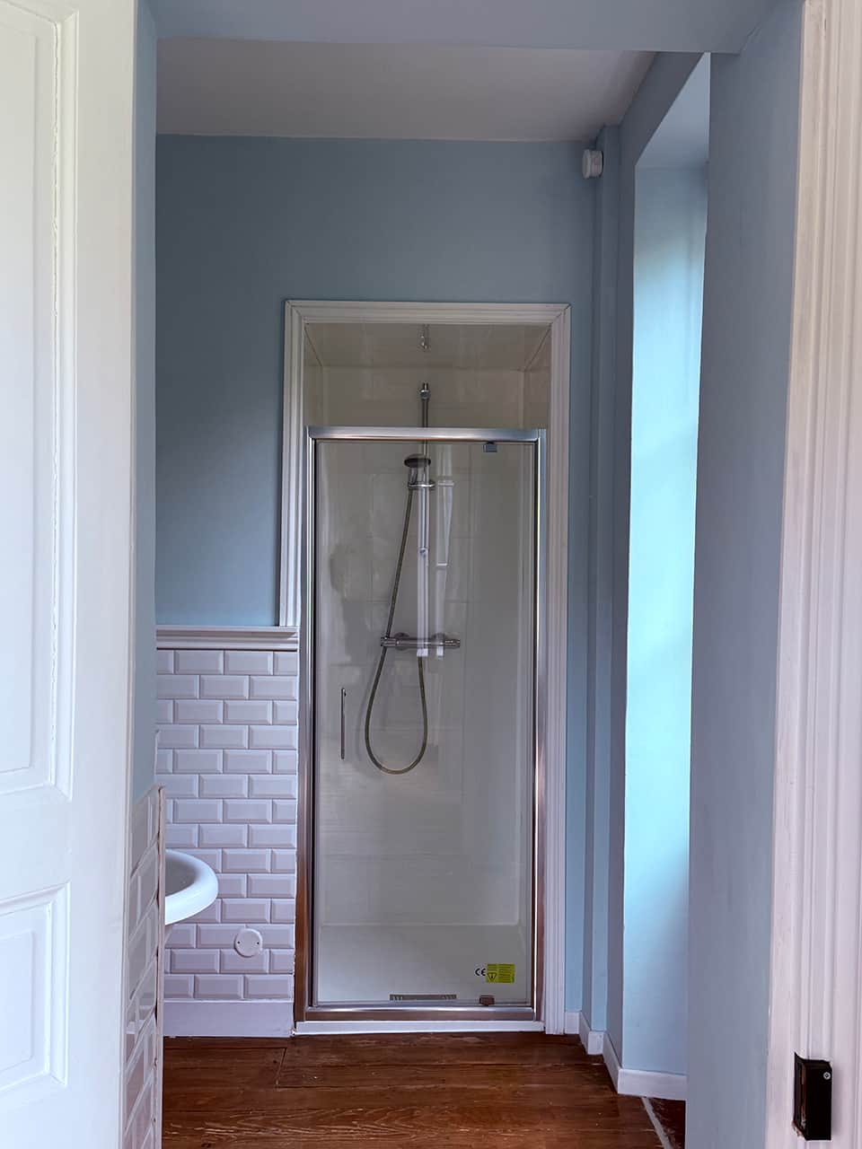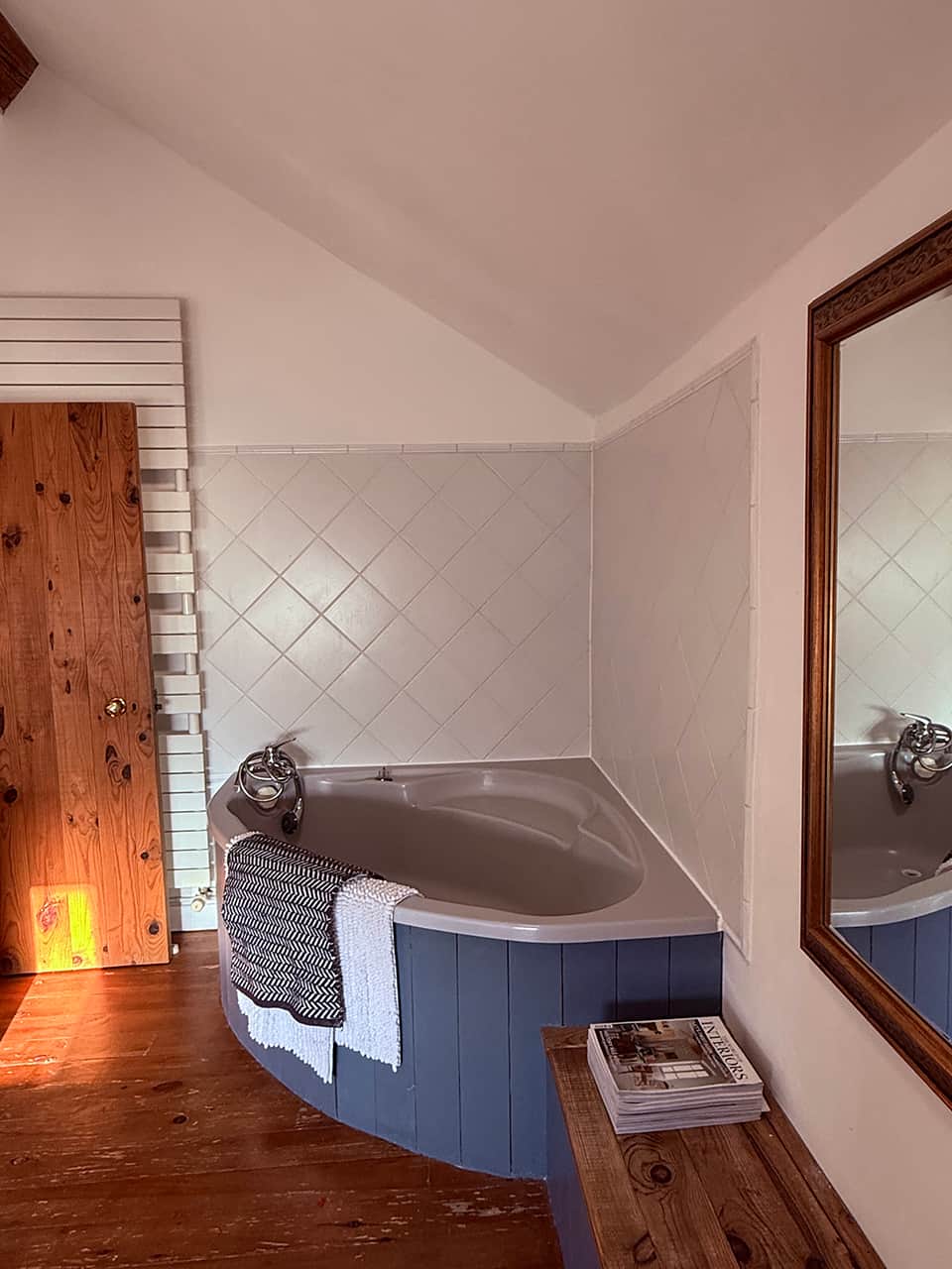 The second-floor bathroom, accessed through two separate doors, is a luxurious space. It includes a walk-in shower, a classic clawfoot bath, a WC, and a pedestal sink—blending modern functionality with vintage appeal for a spa-like experience.