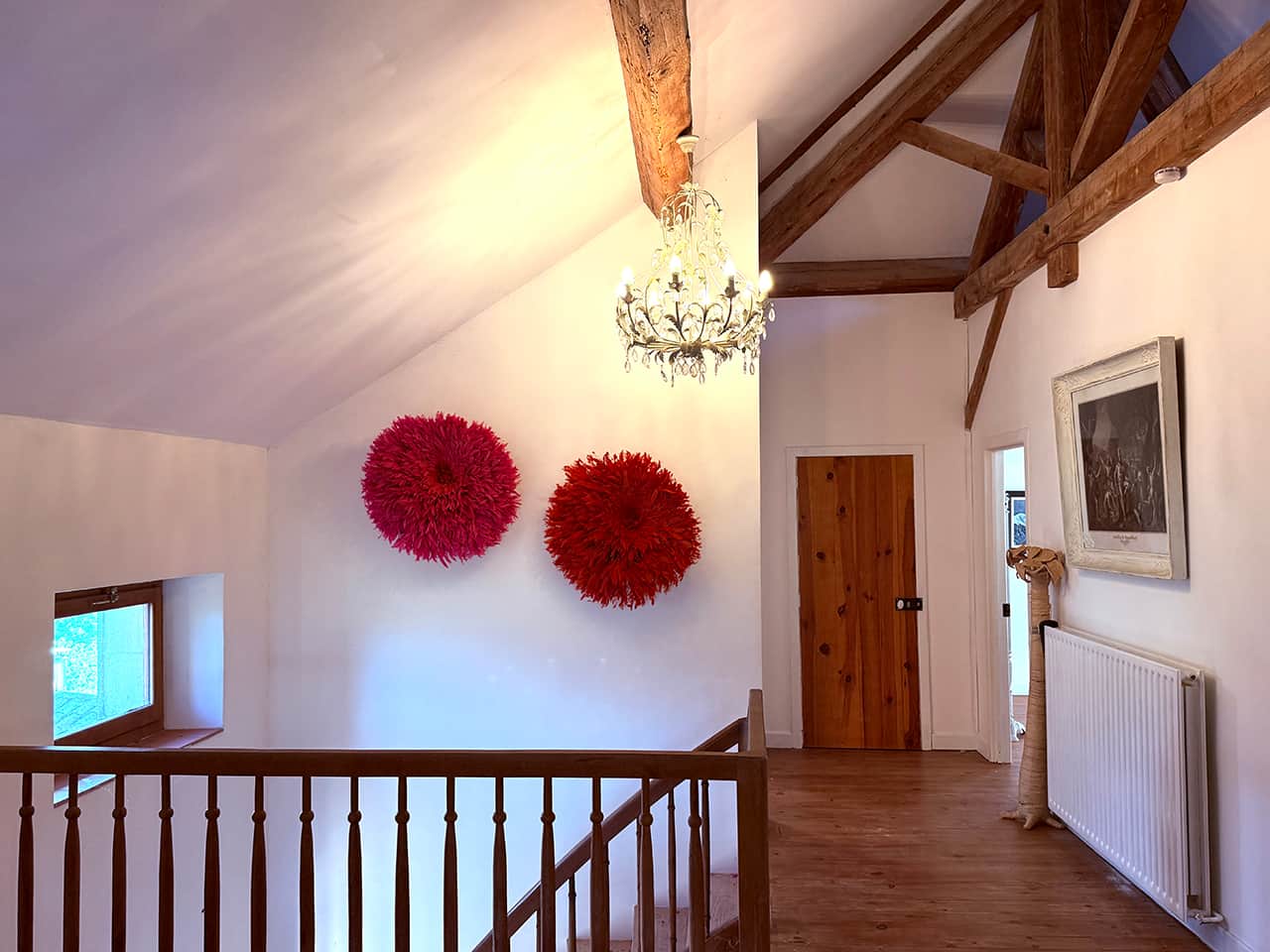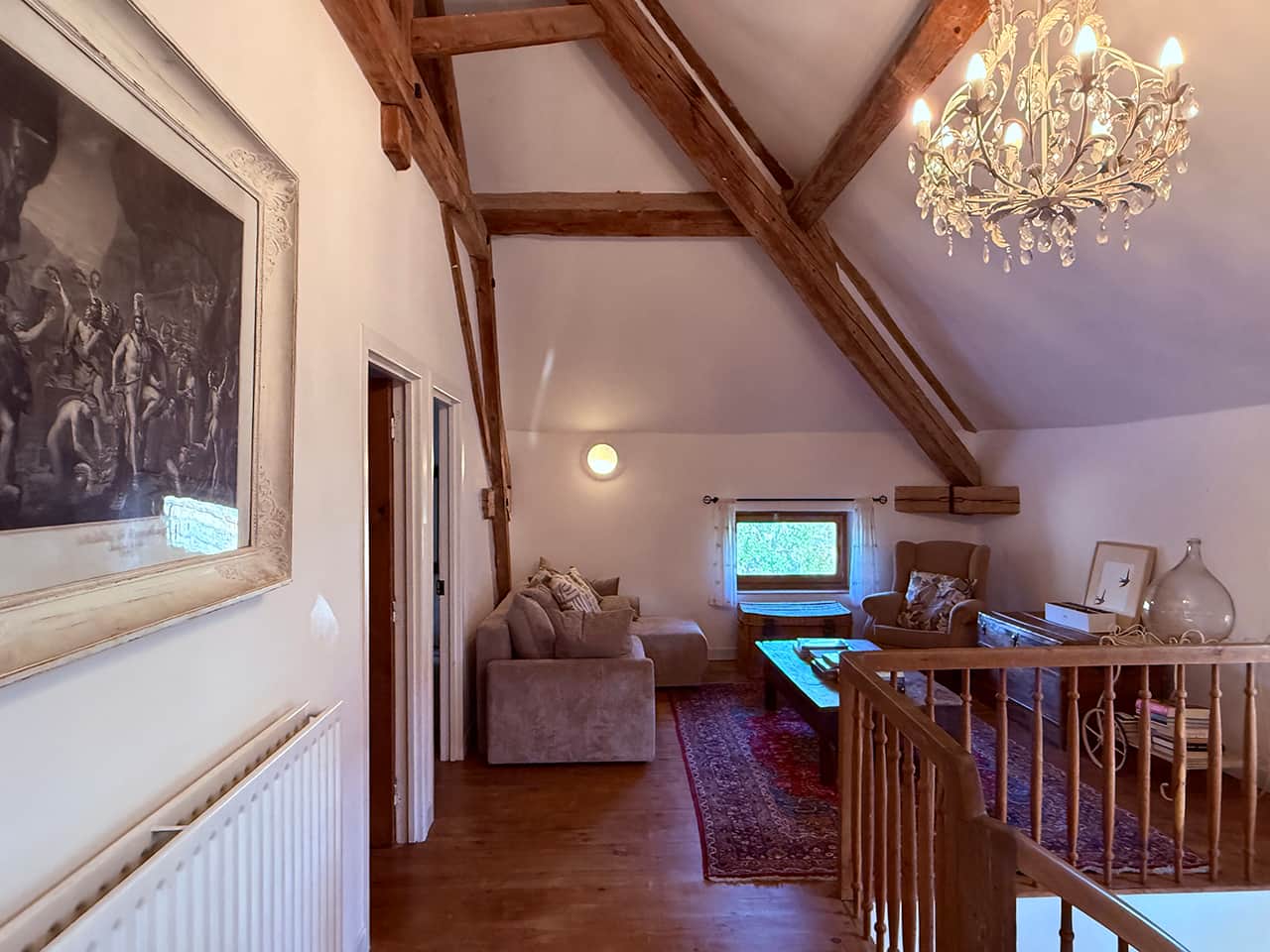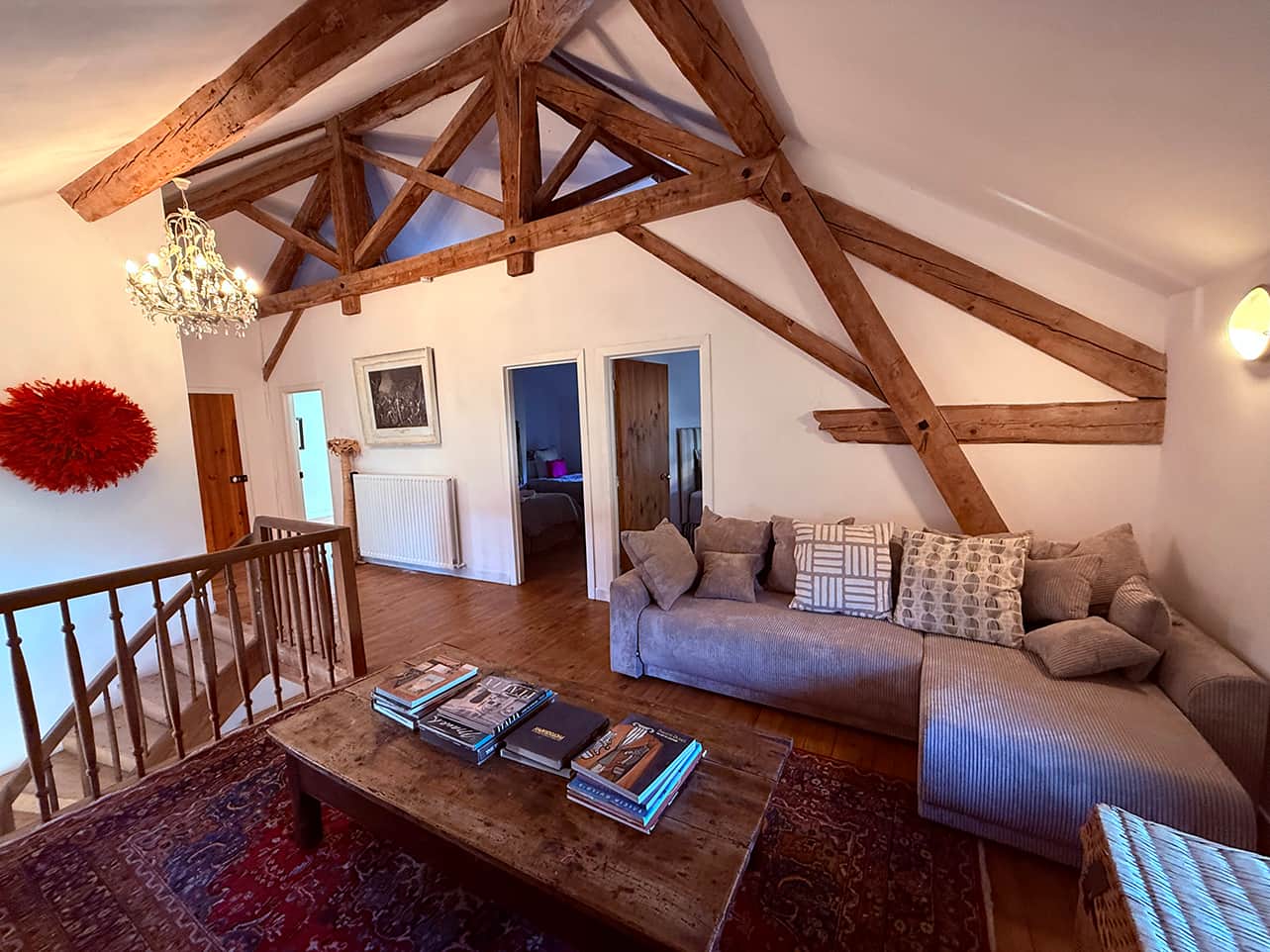 The second level stairs open up onto a spacious landing that connects to the bedrooms, bathroom, and shower room. Off to one side, there’s a large, relaxed chill/TV area—a perfect spot for unwinding after a long day or gathering with family and friends.