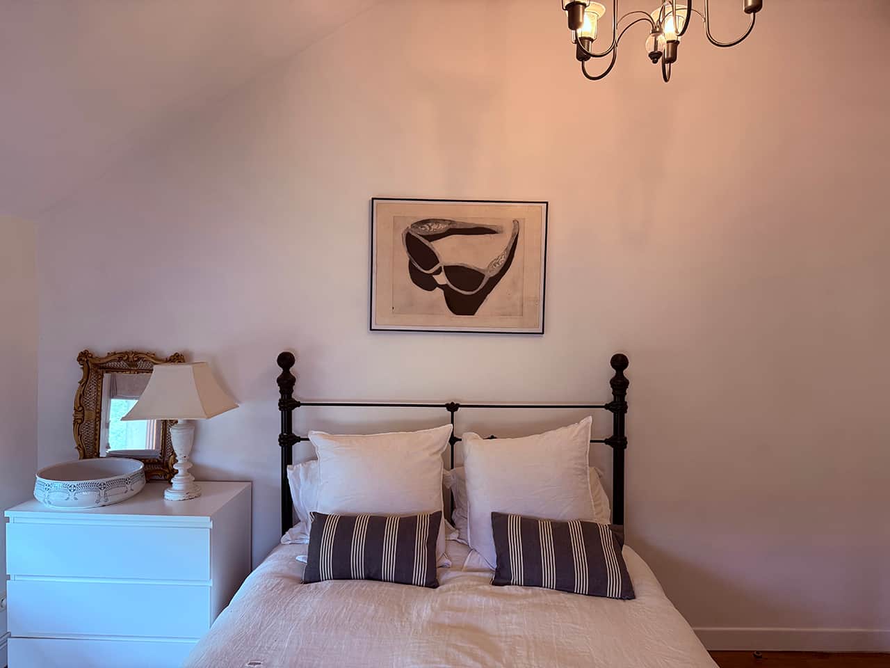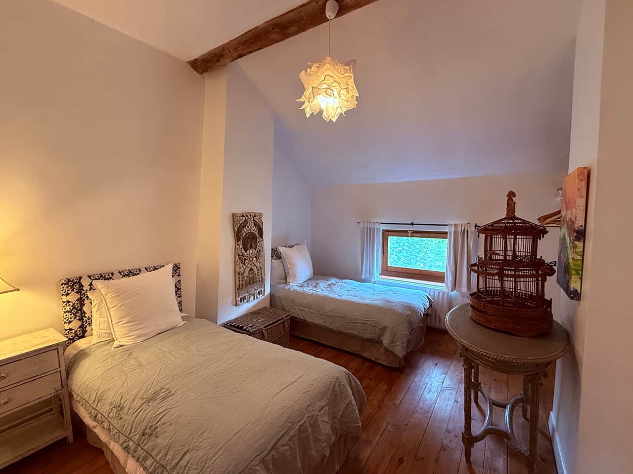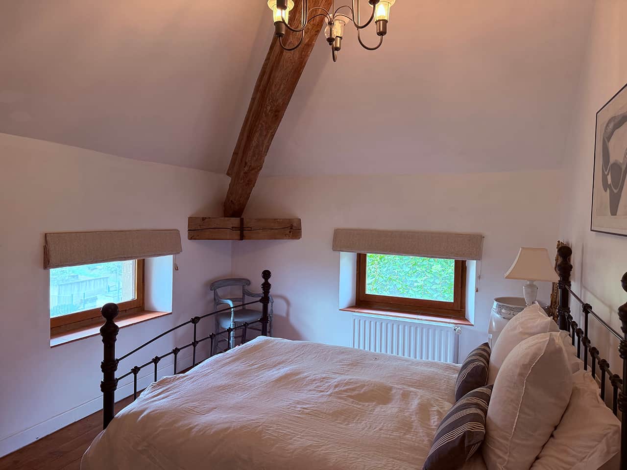 The sixth bedroom, much like the others, enjoys high ceilings and exposed beams, giving the space a rustic, airy feel. Two windows brighten the room, making it an inviting and comfortable spot.