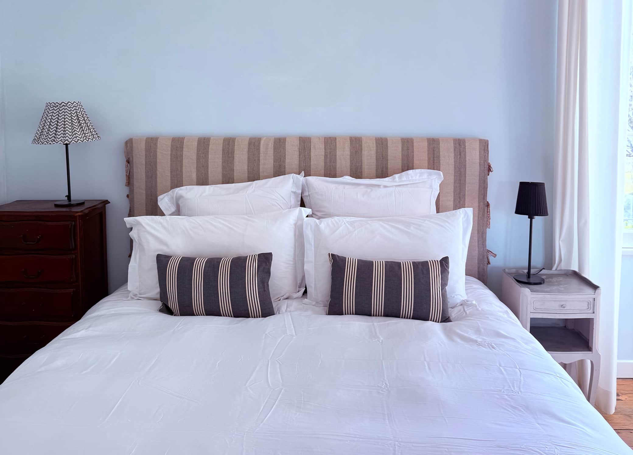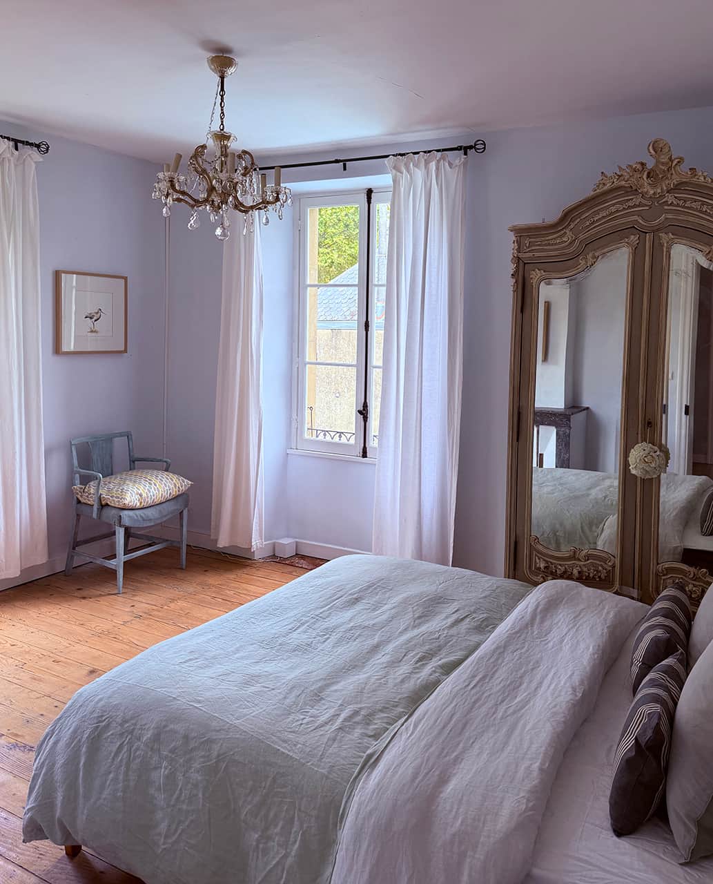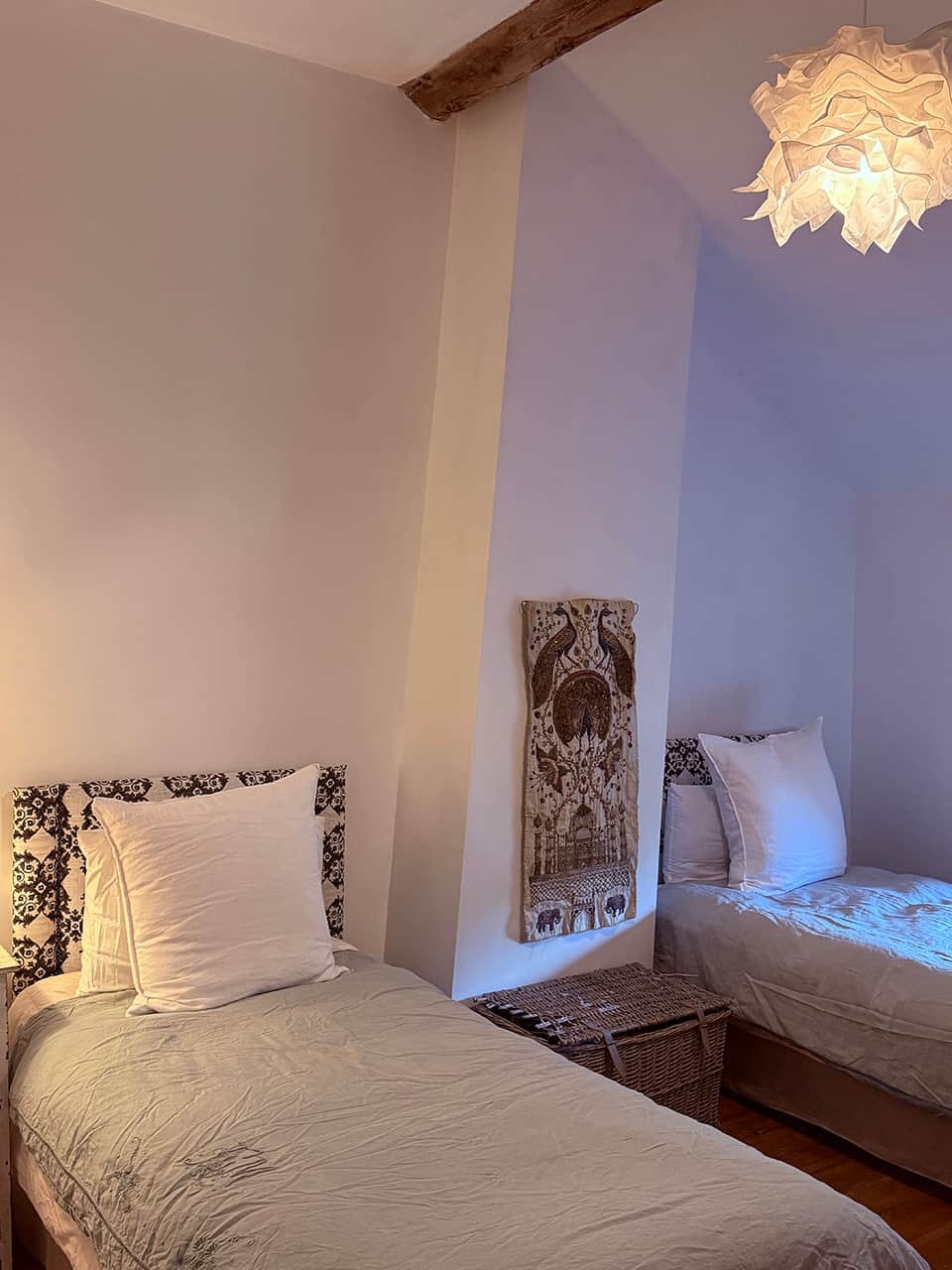 The sixth bedroom, much like the others, enjoys high ceilings and exposed beams, giving the space a rustic, airy feel. Two windows brighten the room, making it an inviting and comfortable spot.