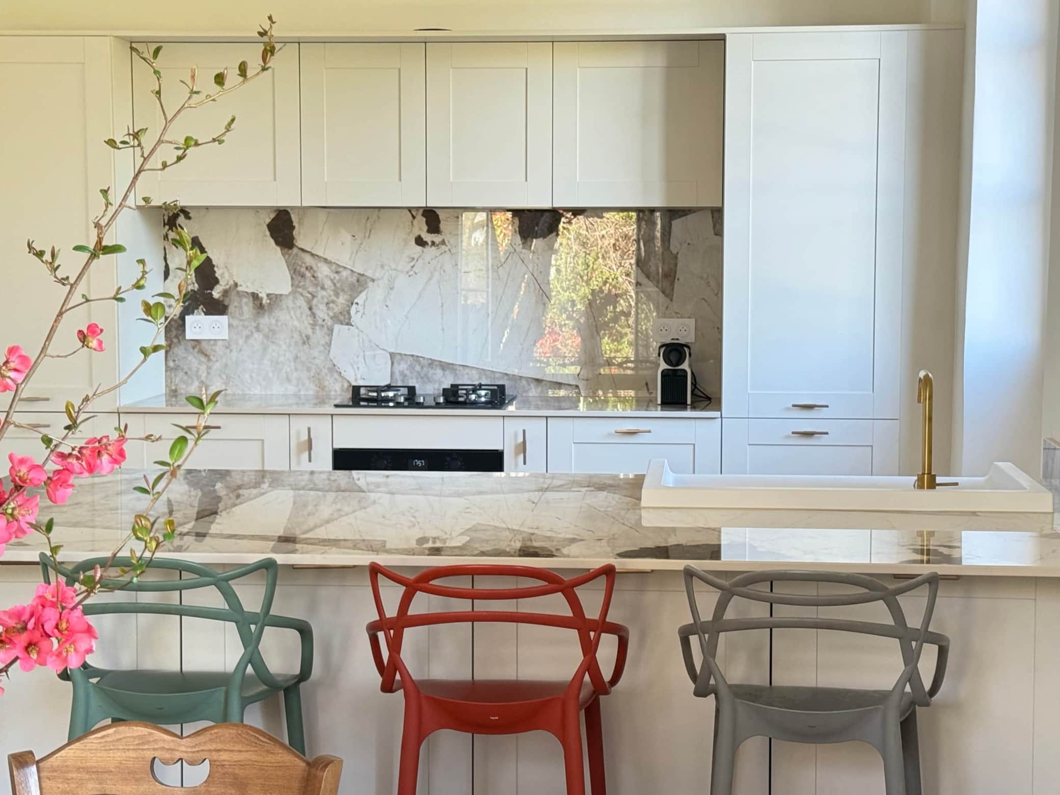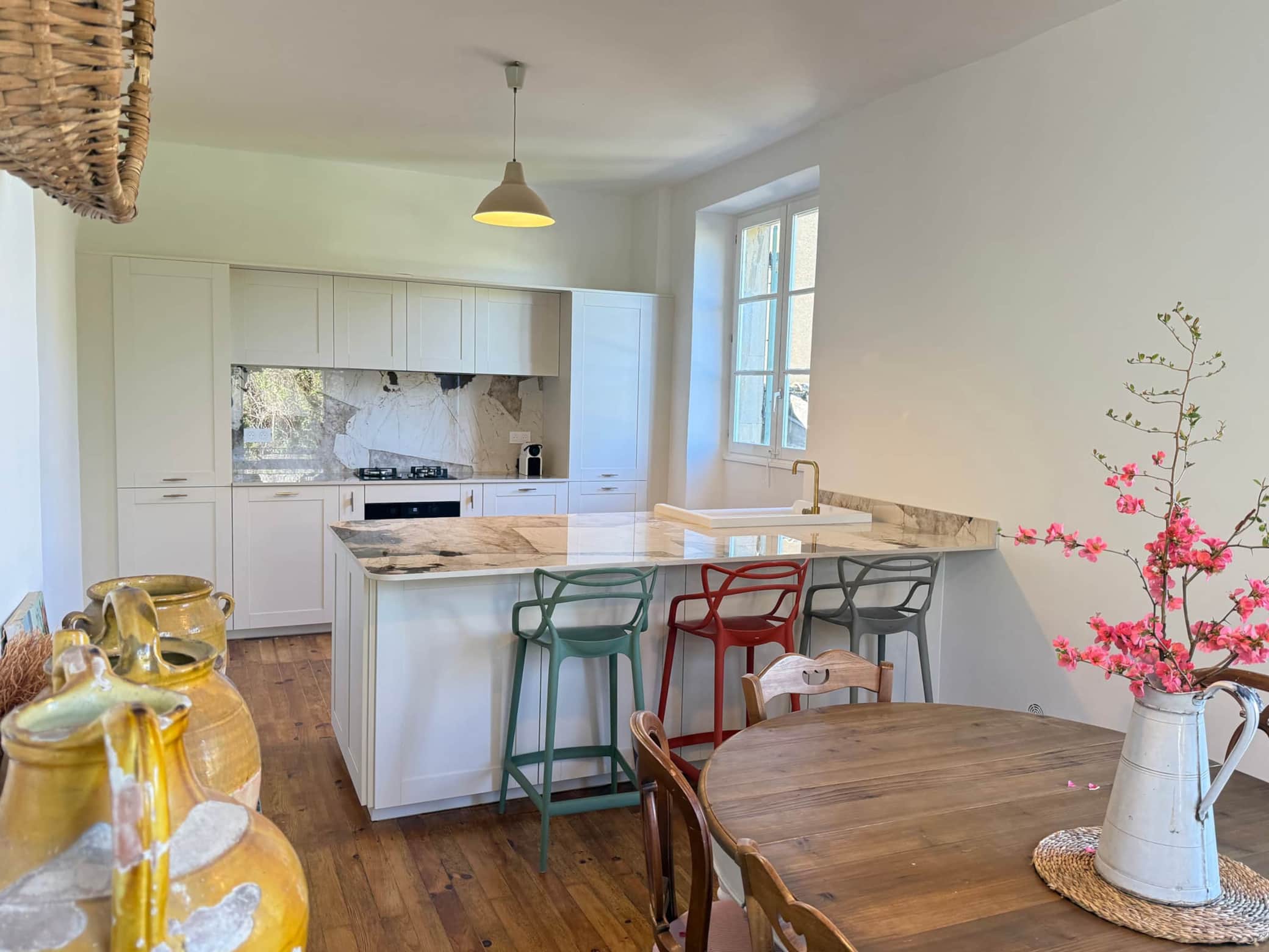 Enter the grand hallway through the original double wooden doors, which swing open to reveal the welcoming heart of the home. To the right, the kitchen and dining area unfold in a spacious, sun-drenched room. The kitchen features a range of wall and floor units, each crowned with elegant natural wood work surfaces. Equipped with an electric oven, a separate gas hob, and a crisp white ceramic sink, the space seamlessly blends modern convenience with timeless appeal. There’s also ample space and plumbing for a dishwasher, adding practicality without sacrificing character.