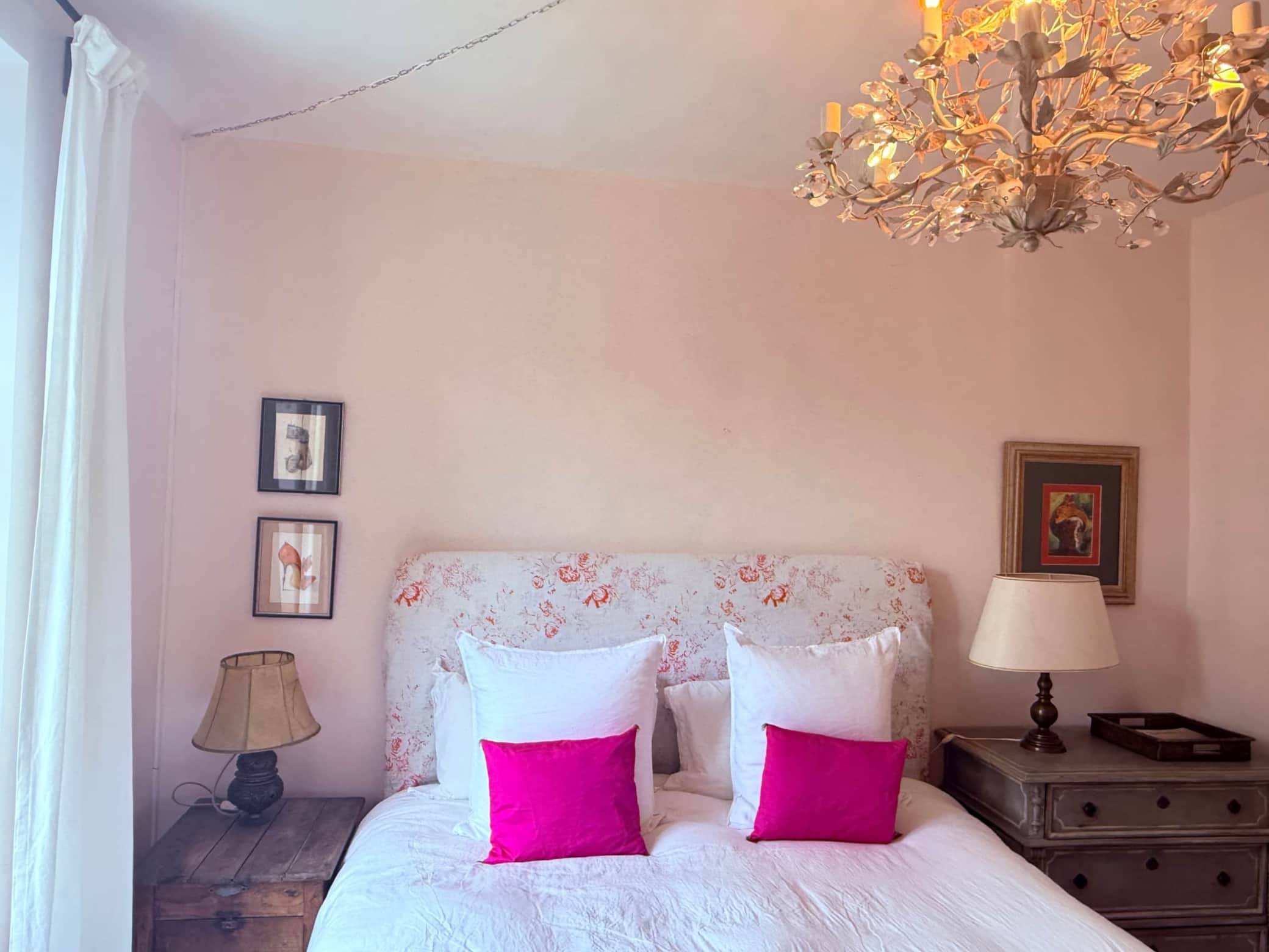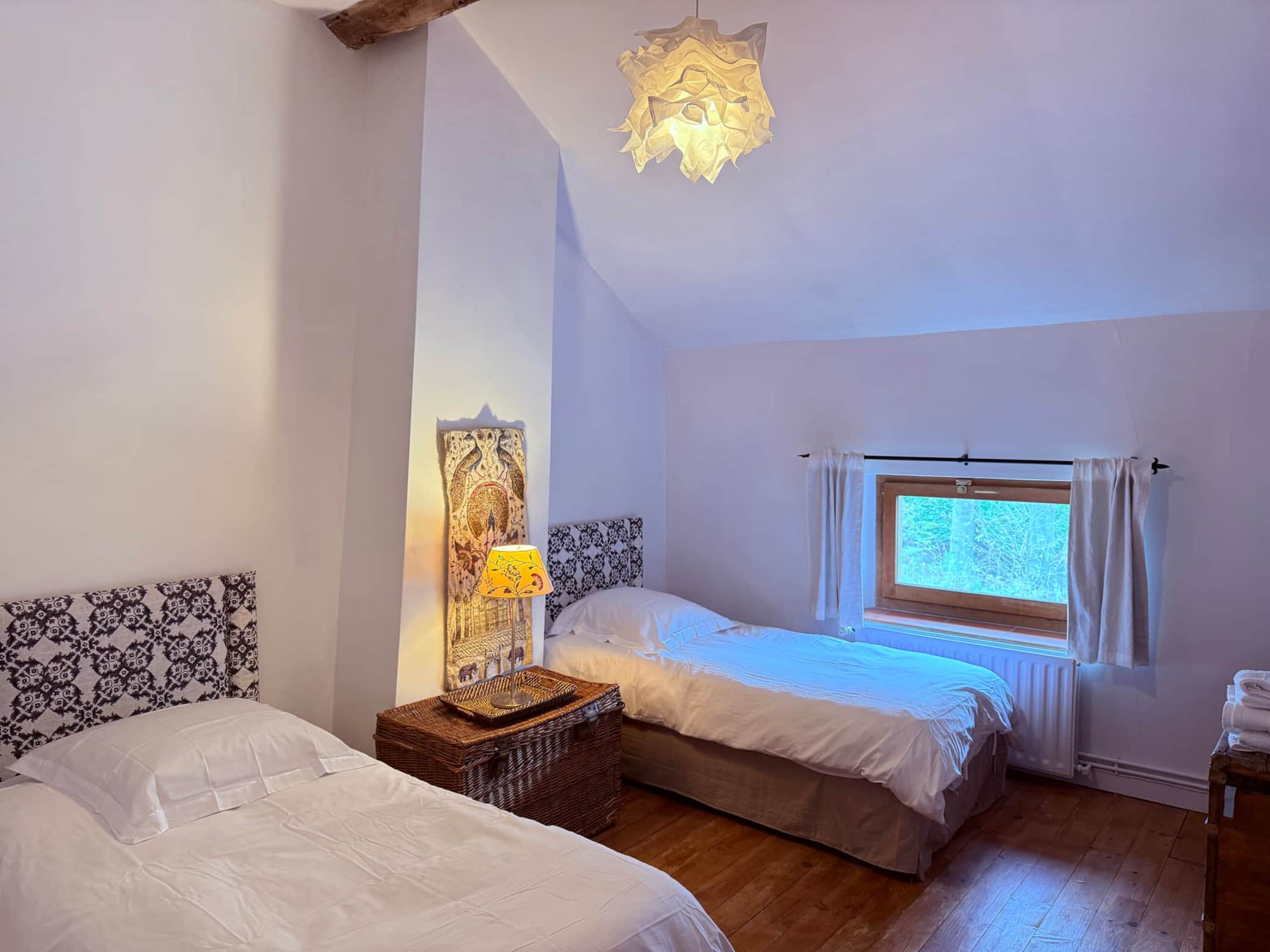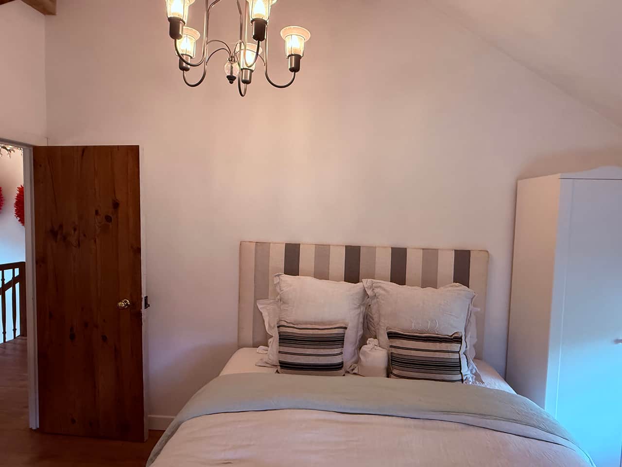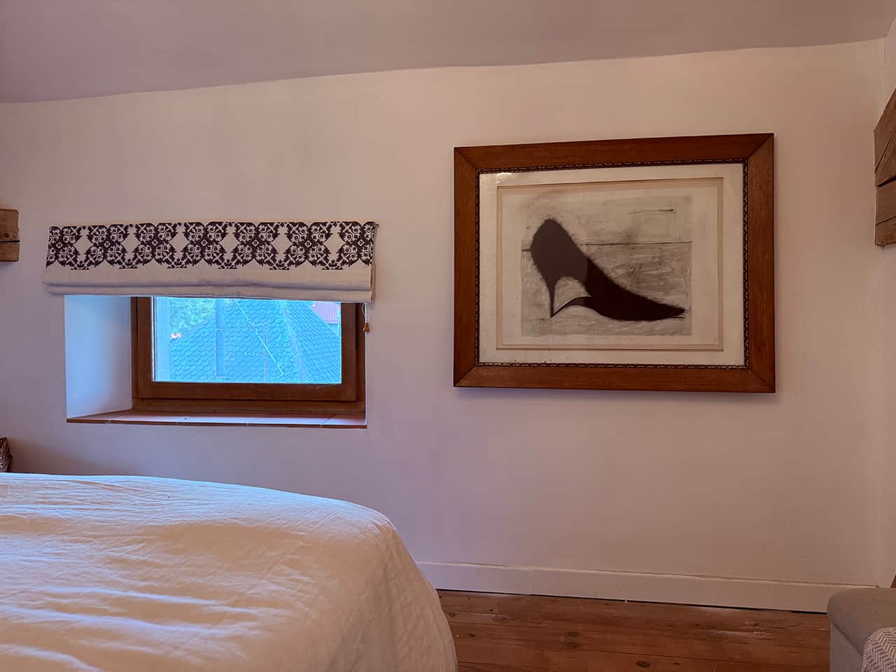 The fifth bedroom also boasts high ceilings with exposed beams, adding to its charm. A single window allows for natural light to stream in, creating a peaceful and serene atmosphere.