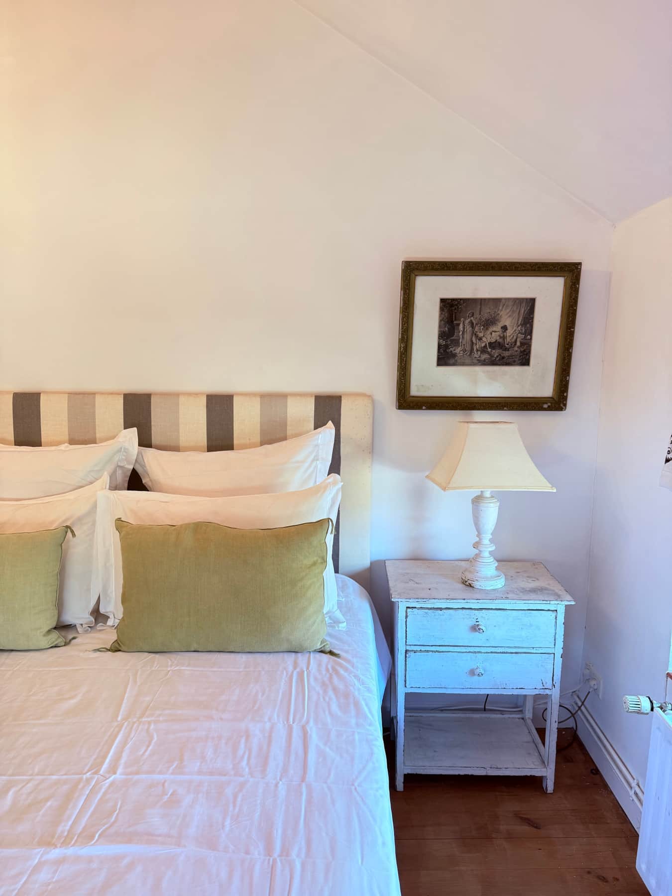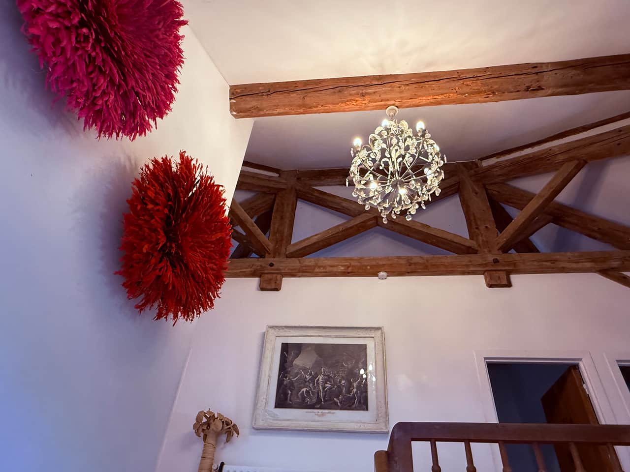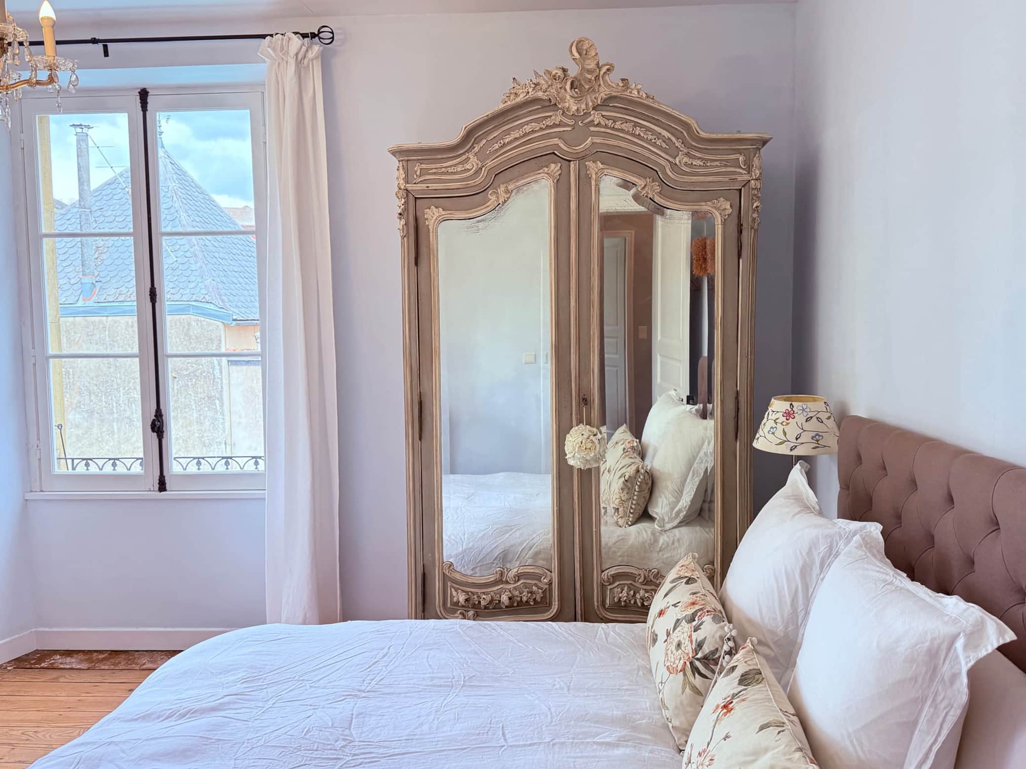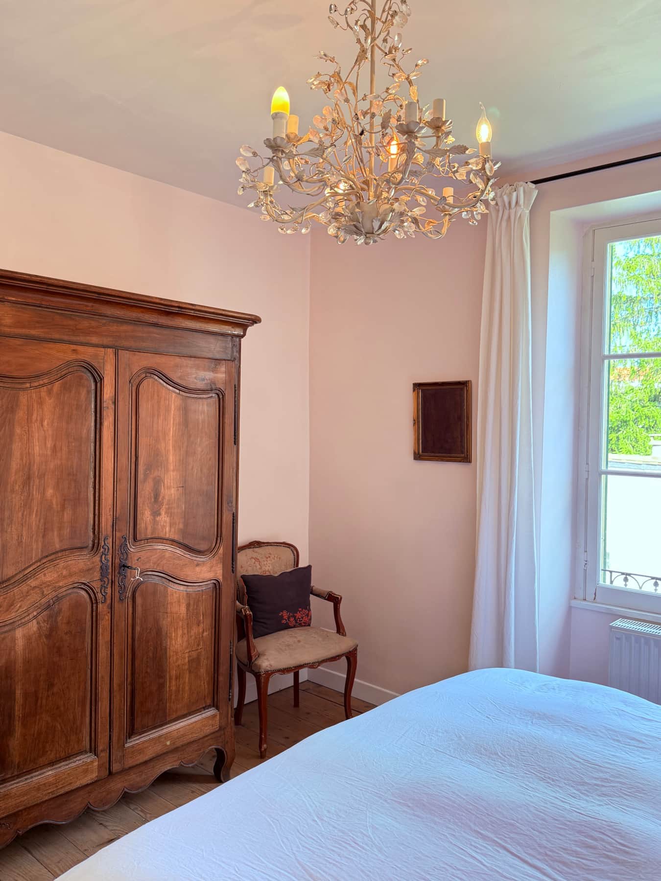 The fifth bedroom also boasts high ceilings with exposed beams, adding to its charm. A single window allows for natural light to stream in, creating a peaceful and serene atmosphere.