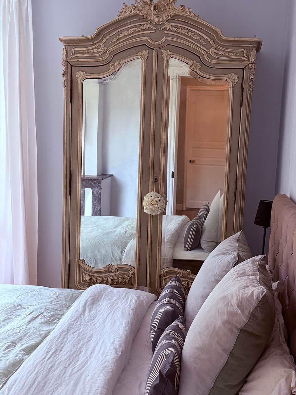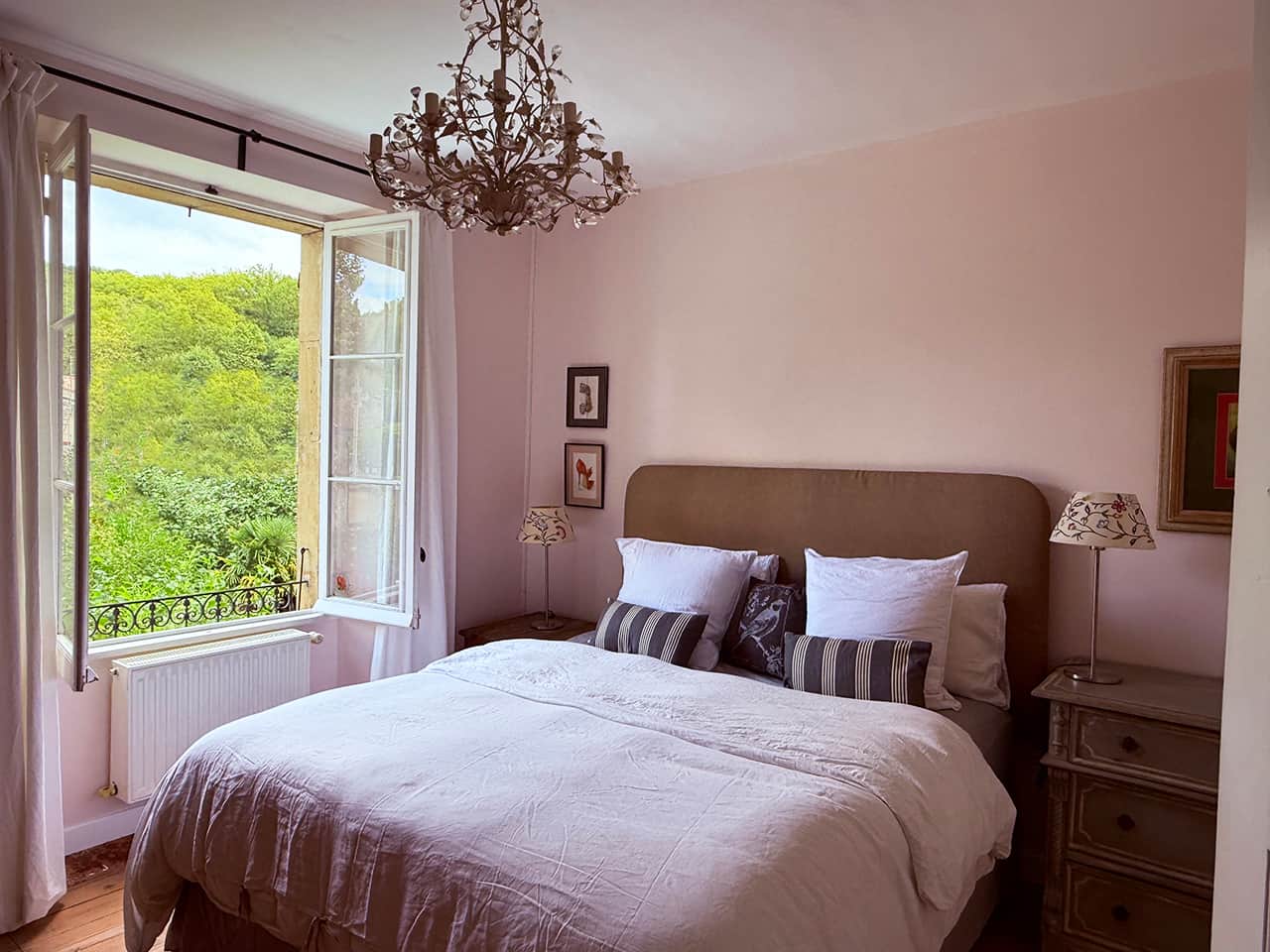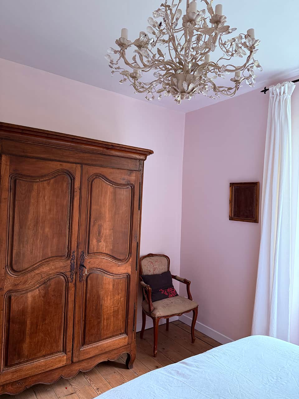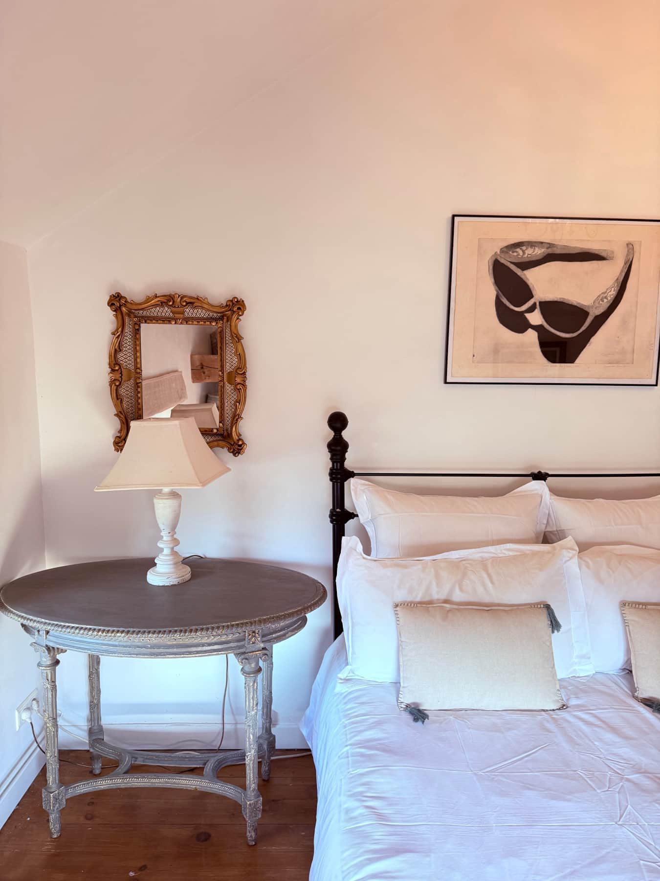 The fifth bedroom also boasts high ceilings with exposed beams, adding to its charm. A single window allows for natural light to stream in, creating a peaceful and serene atmosphere.