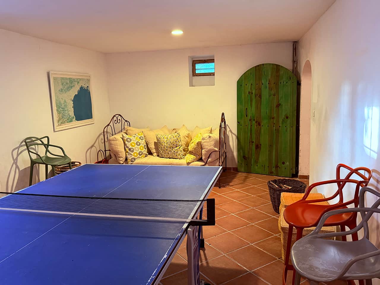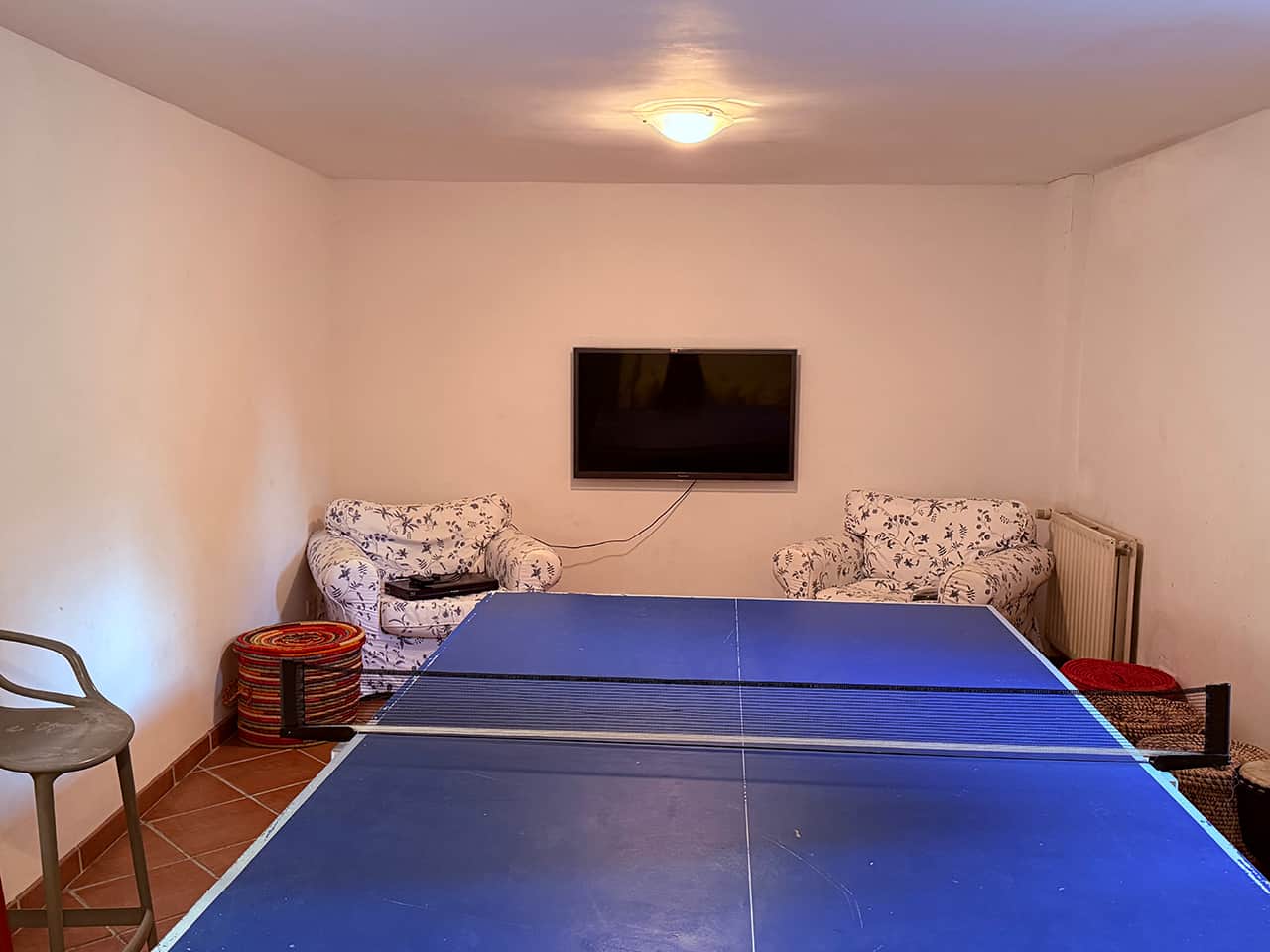 To the left, the basement opens into a spacious area currently set up as a games room. This flexible space offers a fun and relaxed atmosphere. At the far end, on the right, you'll find a small WC with a handbasin, adding practicality to the space without taking away from its recreational purpose.